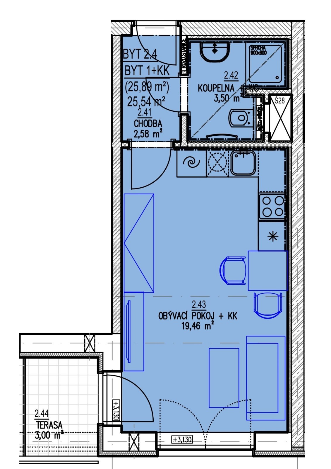 Dispozice: chodba 2,58 m2, kuchyně s pokojem 19,46 m2, koupelna a WC