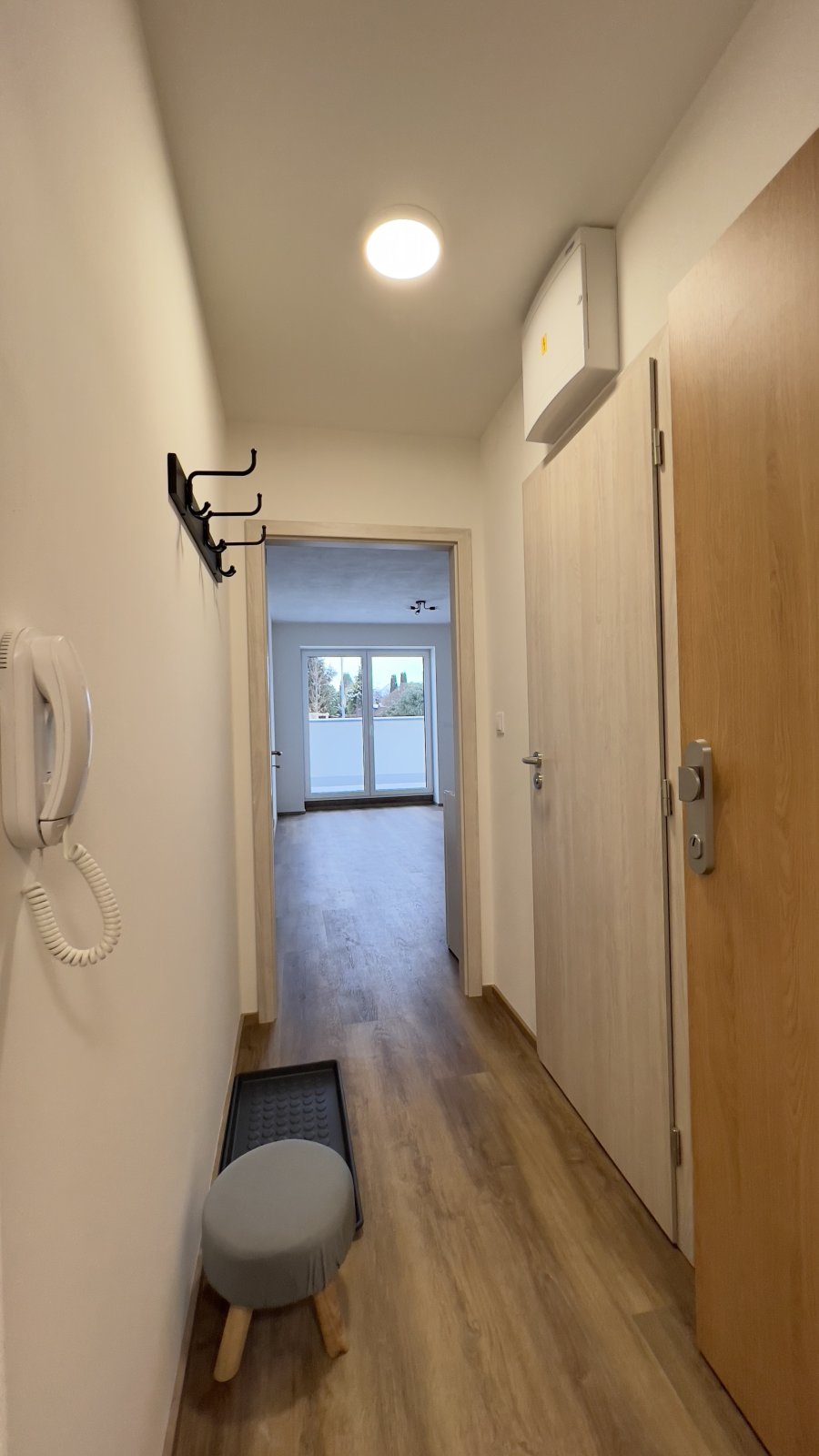 vinylová podlaha a v koupelně dlažba. K dispozici je také domácí telefon