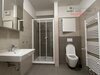 žaluzie v oknech. V koupelně je sprchový kout, umyvadlo, koupelnová