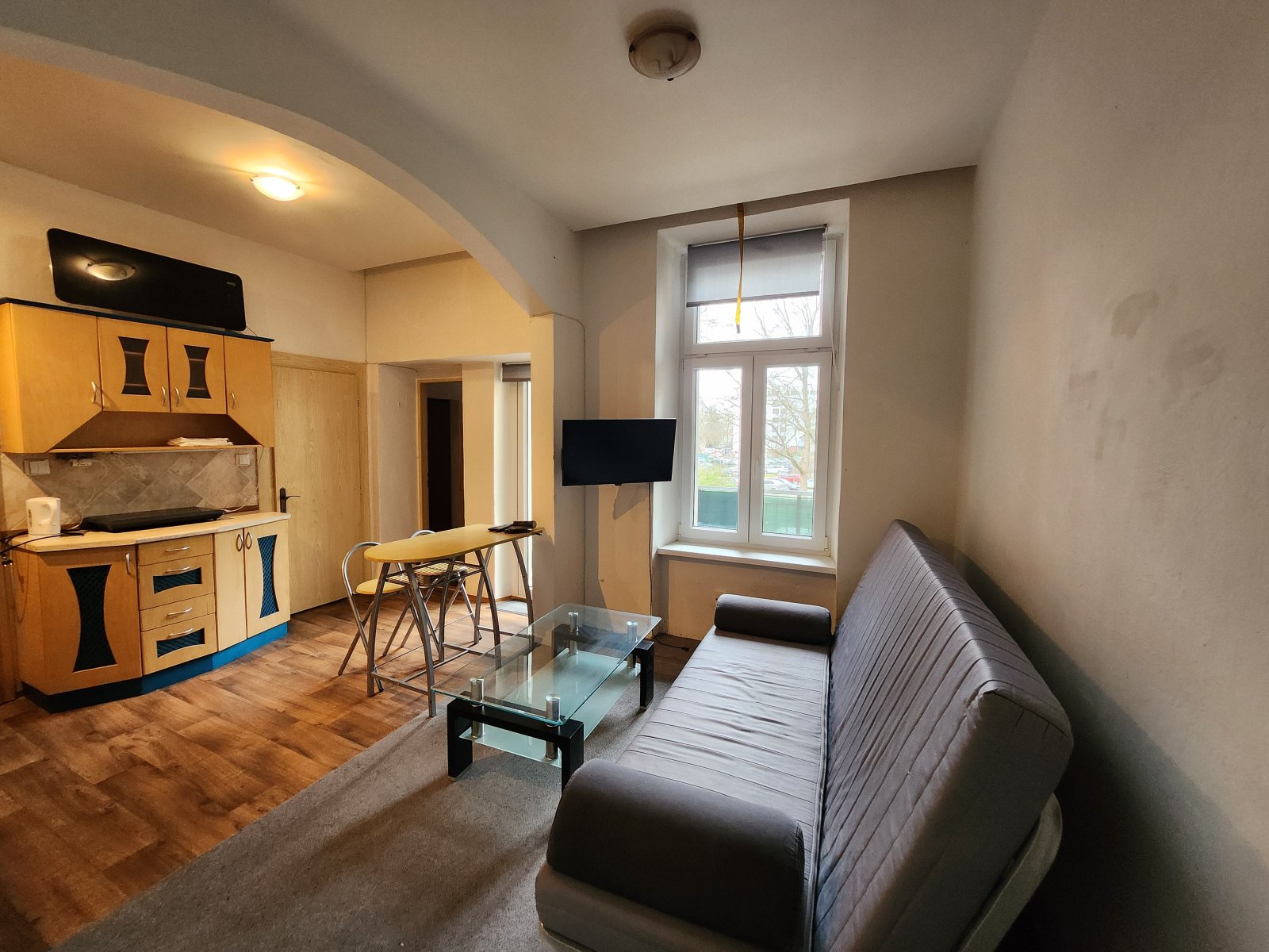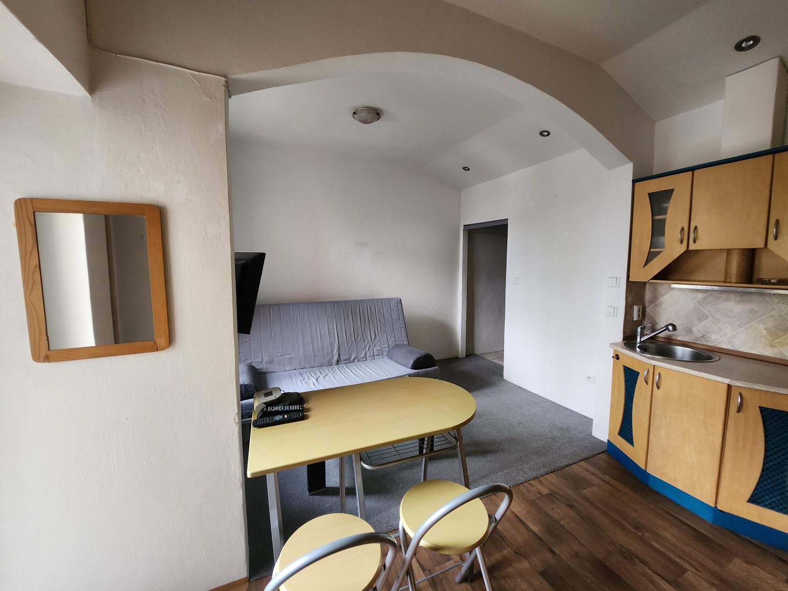 skříňkami, pohovkou, konf. stolkem, kuch. zázemím, spíž, oddělená