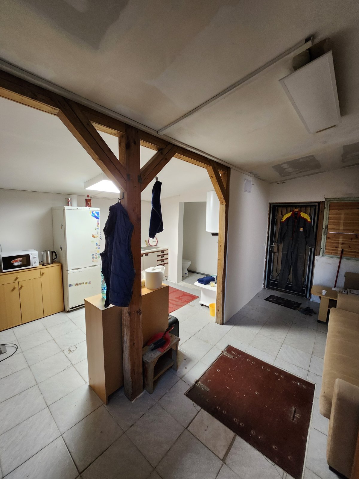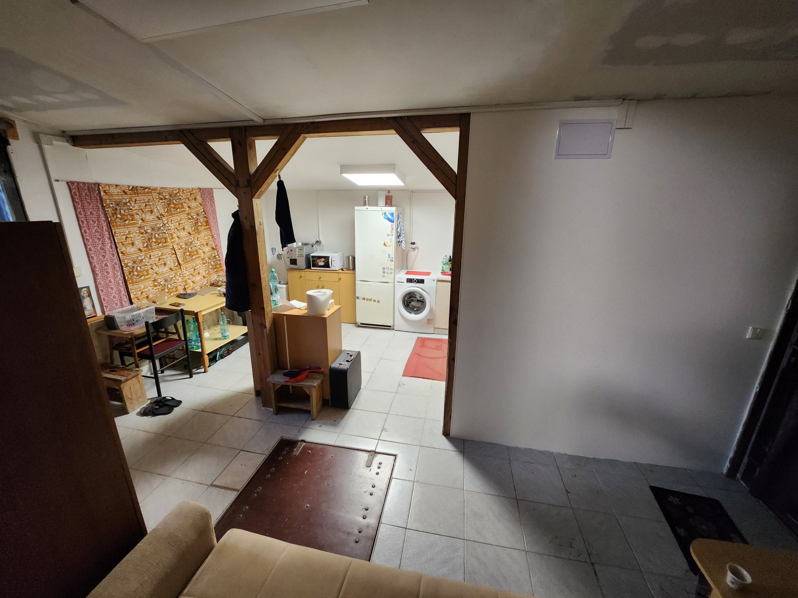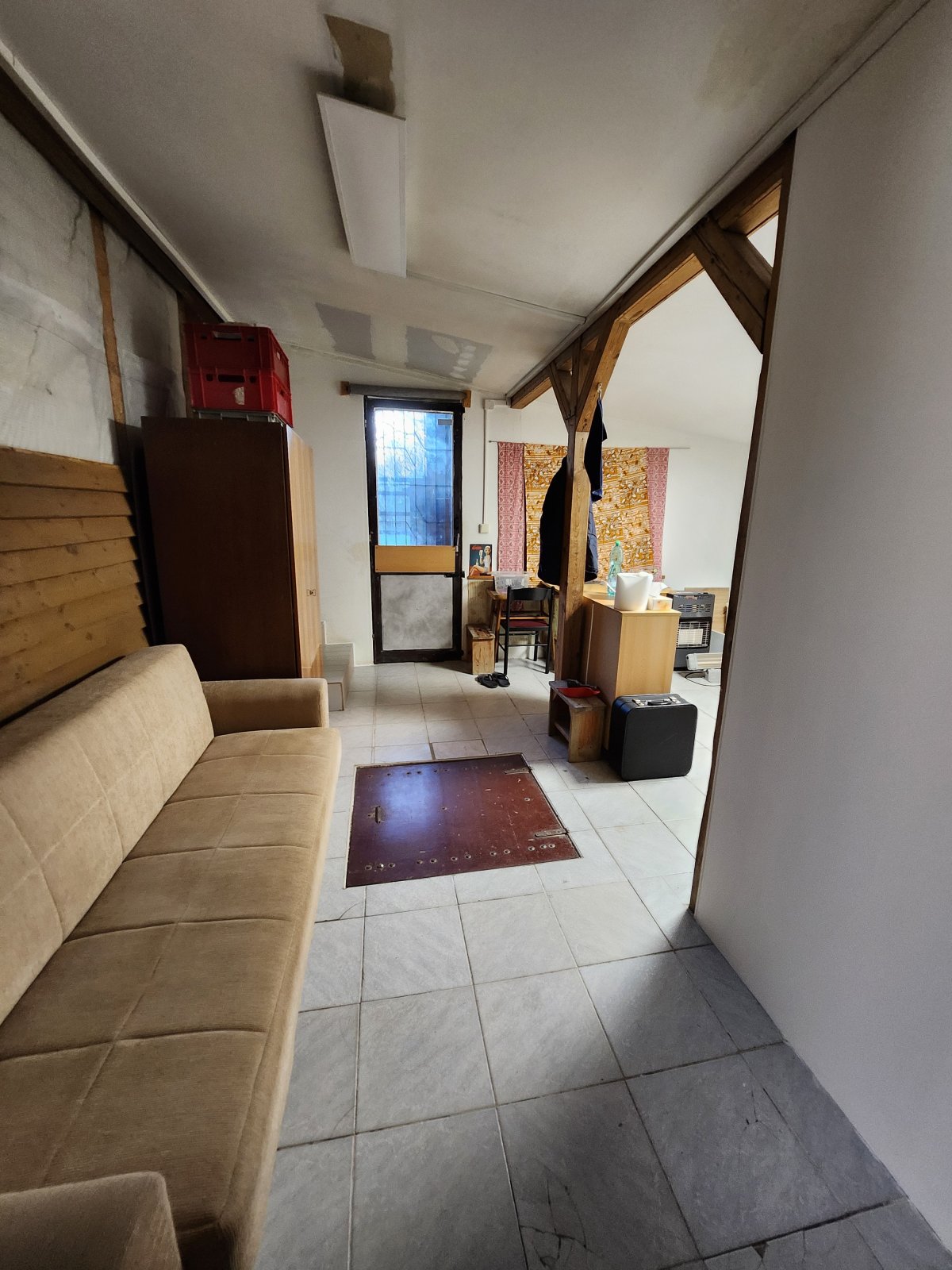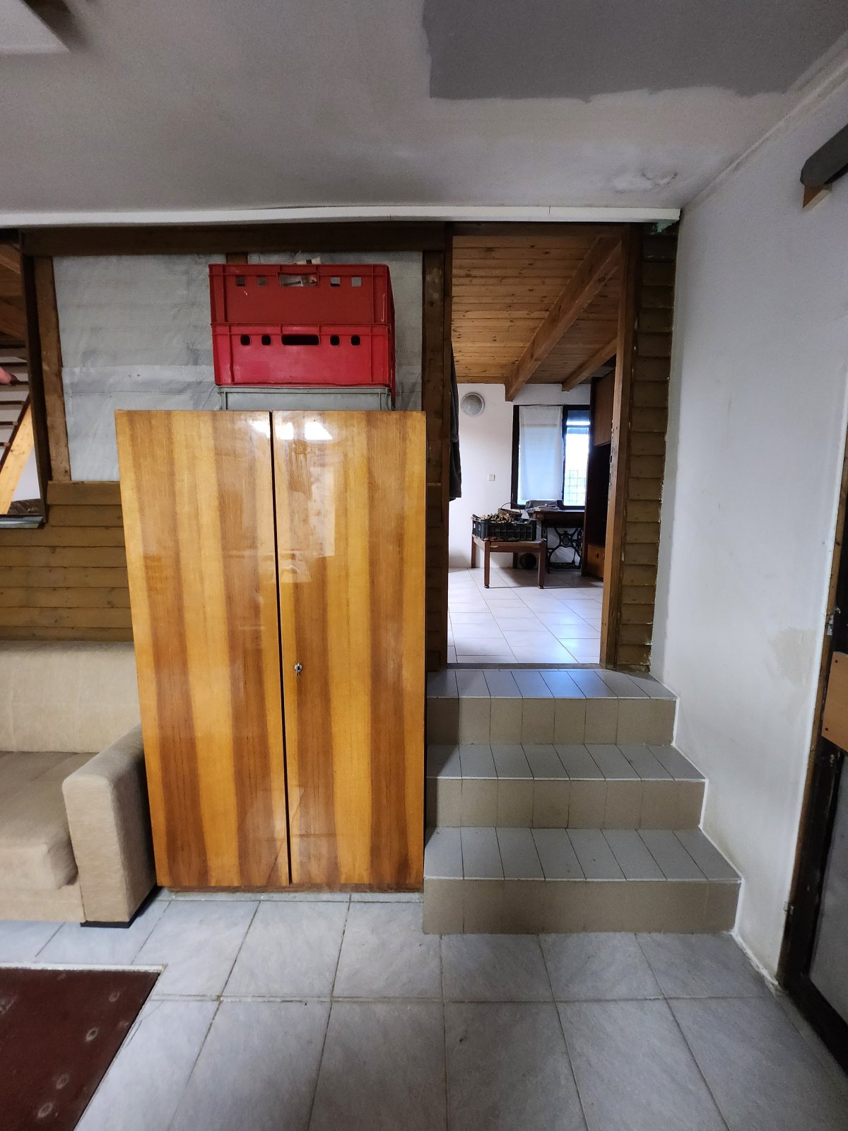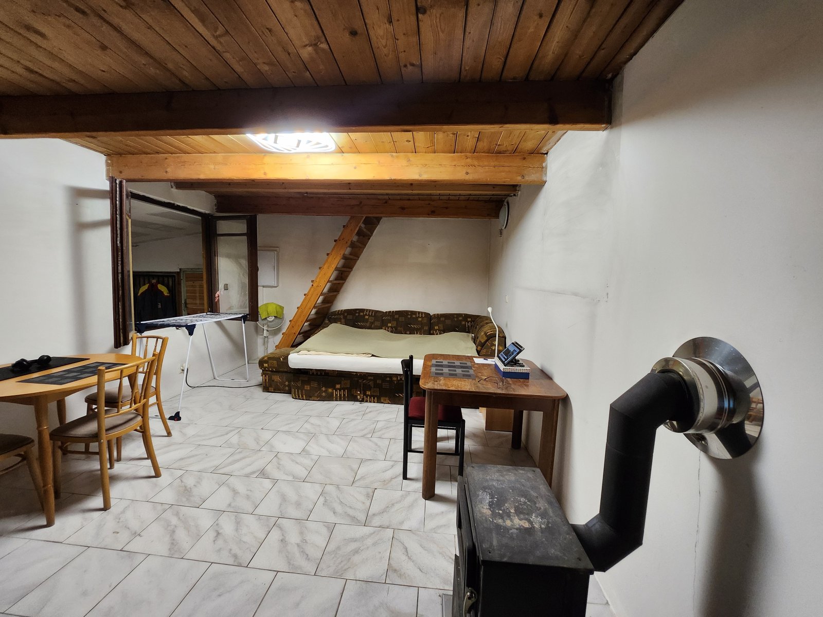 Ve vyvýšenější části chaty obytná místnost cca 25 m2 s kamny na tuhá